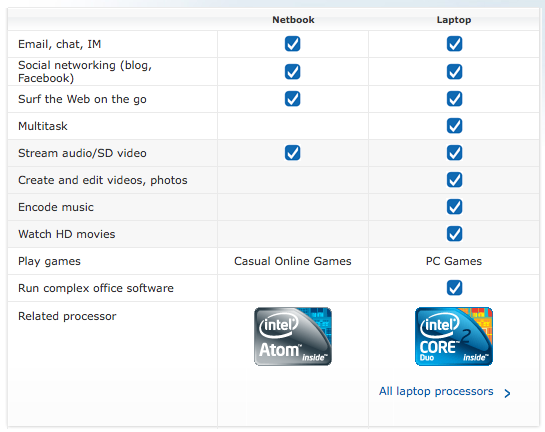 Don’t believe the FUD that Intel is spreading. Technically netbooks can do everything a regular laptop can do, but basically it has a slower processor leading to slower performance. One of the reason Intel could be doing this is to bring up market share of more expensive laptops with the more expensive Core 2 processor from Intel: basically netbooks are cannibalizing the laptop/notebook market and with netbooks having lower profit margins Intel has everything to gain by pushing more people to buy a laptop compared to a netbook.