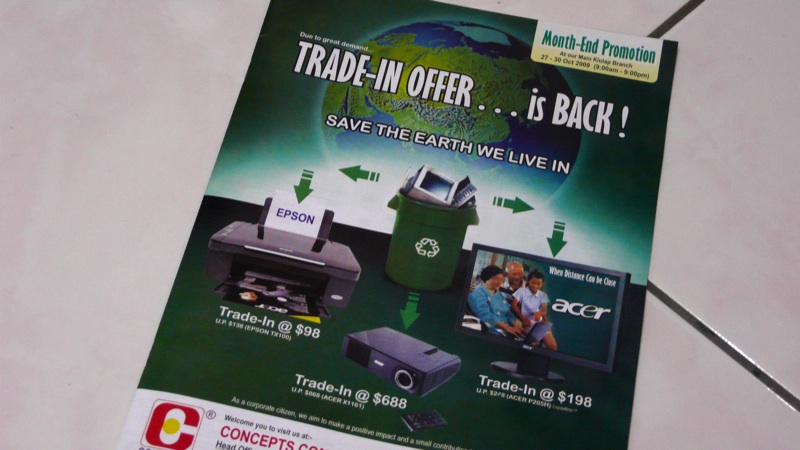 After my post of Concepts Monitor Trade-In where I found out from the owner that they were intending to throw the monitors away, I was pretty happy to see the their ad in the paper that is seen on their handout brochure shown above. “SAVE THE EARTH WE LIVE IN” it says and shows a green bin with a recycling symbol on it. I thought it was great that they are recycling all the monitors and other devices they received from the trade-in offer so I wanted to find out which recycler they were sending the stuff to. So I went to both the Kiulap and Gadong branches to find out more and I was told (at the Gadong branch last Friday) that they were sending it to a recycler in Sungai Akar. However at the Kiulap branch, I was told outrightly today that they were just dumping them and throwing it away. I asked the sales assistant to confirm that they weren’t doing any recycling at all and that they were just throwing them away and she said without hesitation that they were throwing them away.