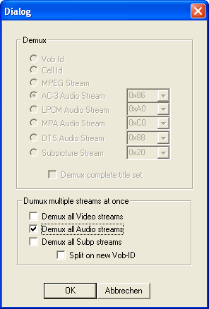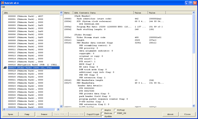 VobEdit (download link) allows you to extract the audio and/or video files from DVD VOB files. Typically I will use ffmpeg to extract audio or video streams from DVDs, but sometimes the DVD were not burned properly giving ffmpeg an error that prevents the extraction. Here is where VobEdit comes it. Select the VOB file, click the "demux" button, select the stream, select save location and you’re done! Other features include splitting, joining and remuxing VOB files