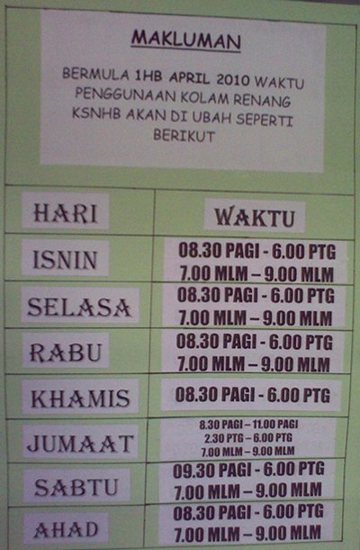 Update (15/Aug/2011): During Puasa / Ramadhan the pools is only open from 9pm-10pm