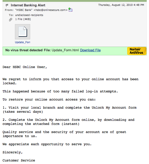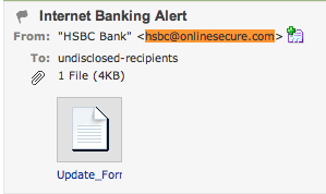 A few days ago I got an email from HSBC Bank regarding my online Internet Banking account, saying that it was locked and that I could go down to a branch to unlock it or fill in the online form to unlock it. Initially I didn’t think much of it until I was about to go to HSBC and I decided to check whether my Internet Banking account was locked. I logged in without issue and grew suspicious of the email I had received earlier. I re-read email I found that it was a phishing email trying to steal my login credentials via the online form that was attached to the email. Below I will detail a few things that help you identify phishing emails or forms