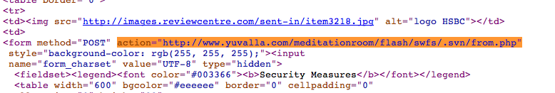 Viewing the source code will show you what makes up the webpage you are viewing. For any form that you fill in you should look for the “FORM” tag and in particular the “action” attribute/value as the “action” attribute/value dictates where the data will be sent. The screenshot below shows the source of the ‘Update Form’ attached to the email and as you can see the website that the data is being sent to (yuvalla.com) doesn’t seem to be a website that has anything with HSBC. Another thing to take note of is that the url has no “https” in the address that it is sending the form. All banking sites should be sending data via https (e.g. https://hsbc.com.bn/ibanking/processing.php not http://hsbc.com.bn/ibanking/processing.php) as HTTPS connections are encrypted (HTTPS server certificates must also be originating from a trusted source, e.g. the bank itself, in order to ensure that the encryption is between a trusted source and not a random malicious hacker’s computer/server).