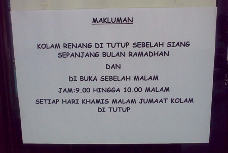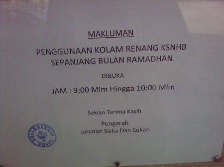 Swimming Pool Hours for Ramadhan thewheat Brunei August 20, 2010August 20, 2010 1 Minute National Stadium Swimming Pool is open 9pm – 10pm Anggerek Swimming Pool is open 9pm-10pm except Thursday night which it is closed Share this: Click to share on X (Opens in new window) X Click to share on Facebook (Opens in new window) Facebook Like Loading... Published by thewheat View all posts by thewheat Published August 20, 2010August 20, 2010