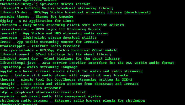 So after the ‘failure’ in Part 1 the next step was to roll my own solution. I’ve been listening to the TWiT.tv network since Leo Laporte started it many years back and I noticed that they were running an Icecast server at TWiT.am that streams their audio. Perfect, a great place to start off so do a simple search for icecast on my Ubuntu box which gave the following results.