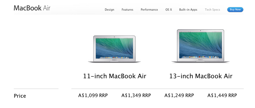 1. Apple: basically 2 different skews of notebooks each has 1 page for all specs and extra text with configuration options. Shows full specs and starting prices (MBAs /MBPs)