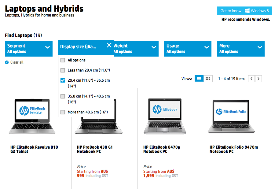 5. HP: the main page separates devices into “Home” and “Work” which I don’t really like. Results show (screen size and possibly price). Filtering by size shows a checkbox list but it works like an option dropdown – you can select only one. There is no filtering based on processor, so results could be showing you old laptops. Comparison of up to 3 devices to see further specs. 40 devices in total.