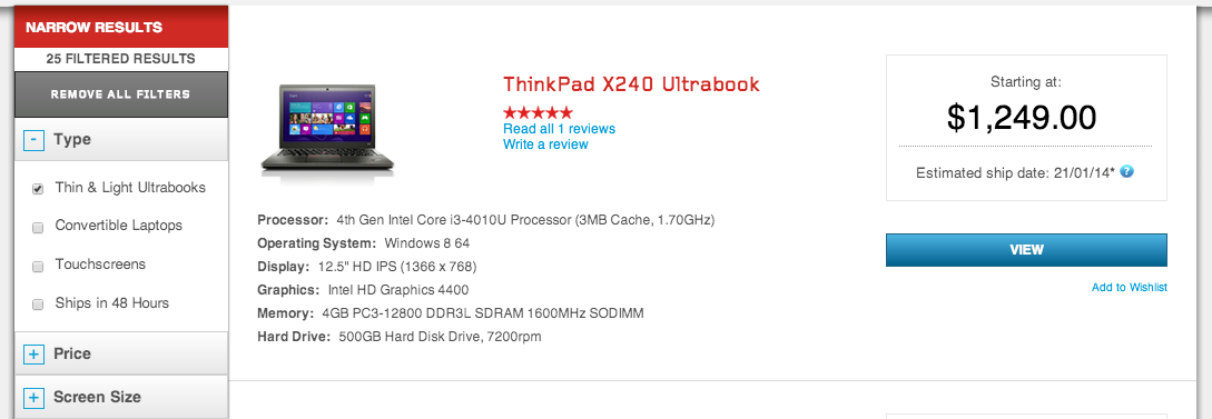3. Lenovo: results show main specifications (CPU, Graphics, RAM, storage, screen size & resolution, OS, price) items list shows main specifications and has nice sidebar filtering but no filtering on screen resolution. Does not show possible upgrades. No comparison
