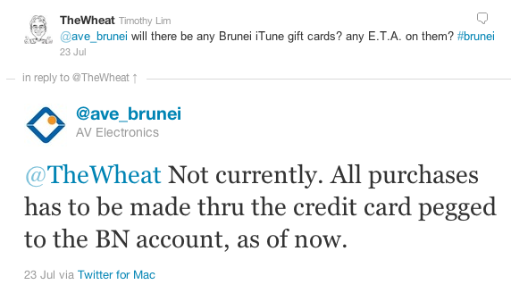 AV Electronics, the premium reseller of Apple products, says they aren’t currently selling Brunei iTunes gift cards